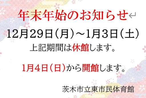 2025年12月11日 / 最終更新日時 : 2025年12月11日 hamamoto お知らせ 【お知らせ】年末年始休館について〈茨木市立東市民体育館〉 12月29日(月)から1月3日(土)まで休館します。 年始は1月4日(日)から、通常どおり開館します。